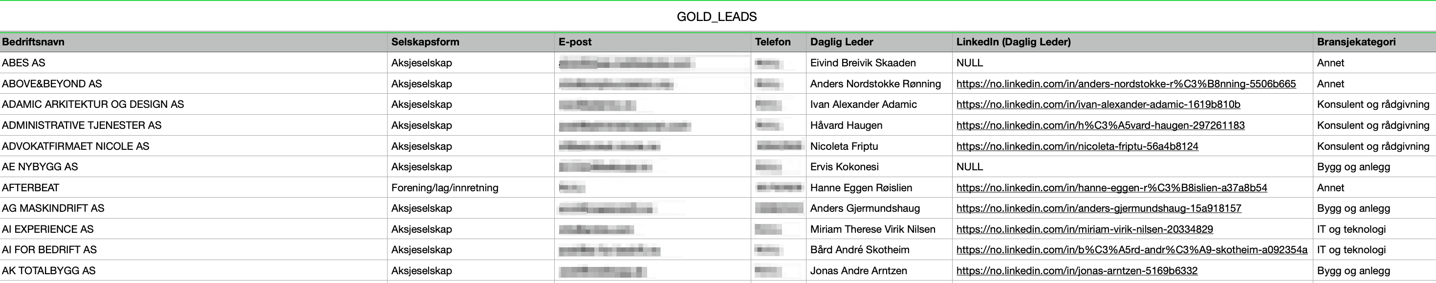 Få en verifisert, AI-beriket liste over alle nye AS og ENK registrert i Norge. Direkte e-post og telefonnummer til daglig leder, levert i innboksen din hver mandag kl. 07:00.